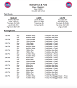 5/3/24 UPDATE: Due to weather concerns, King City has decided to push the start of tomorrow's district track meet back 3 hours, to 11:30am (coaches meeting). Field events will begin at 12:30pm, running events at 1:30pm. They anticipate running the final event (4x400 relay) at 5:25pm. Attached is the updated schedule.