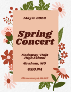 The Elementary & JH/HS Spring Music Concert will be held on Thursday, May 9 at the high school in Graham. The concert will start at 6:00 PM.